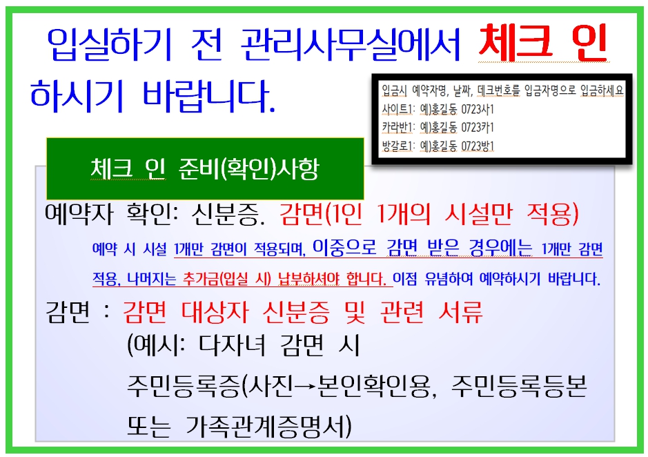 입금시 예약자명,날짜,시설명,시설번호를 예약자명으로 입금하세요.사이트 예)홍길동0723사1카라반 예)홍길동0723카1방갈로 예)홍길동0723방1